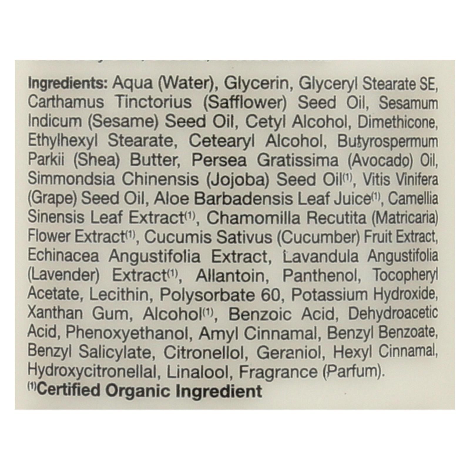 ingredients : aqua;water;glycerin;glyceryl stearate se;carthamus tinctorius;safflower;seed oil;sesamum indicum;sesame;cetyl alcohol;dimethicone;ethylhexyl stearate;cetearyl alcohol;butyrospermum parkii;shea;butter;persea gratissima;avocado;oil;simmondsia chinensis;jojoba;¹;vitis vinifera;grape;aloe barbadensis leaf juice;camellia sinensis leaf extract;chamomilla recutita;matricaria;flower extract;cucumis sativus;cucumber;fruit extract. Echinacea angustifolia extract;lavandula angustifolia;lavender;extract;all