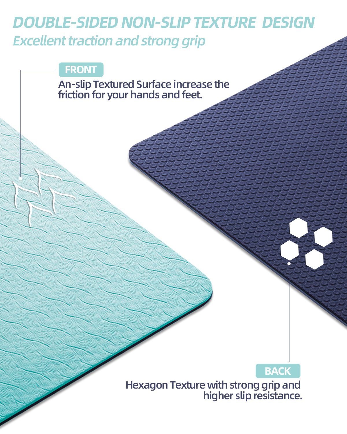 The design of anti-skid texture on both sides and Hexagon texture(unique patented non-slip pattern) on the back, features good cushioning and optimal grip. The yoga mat non slip shows the excellent anti-slipping on all kinds of grounds, for example, wood floor, cement floor,tile floor.