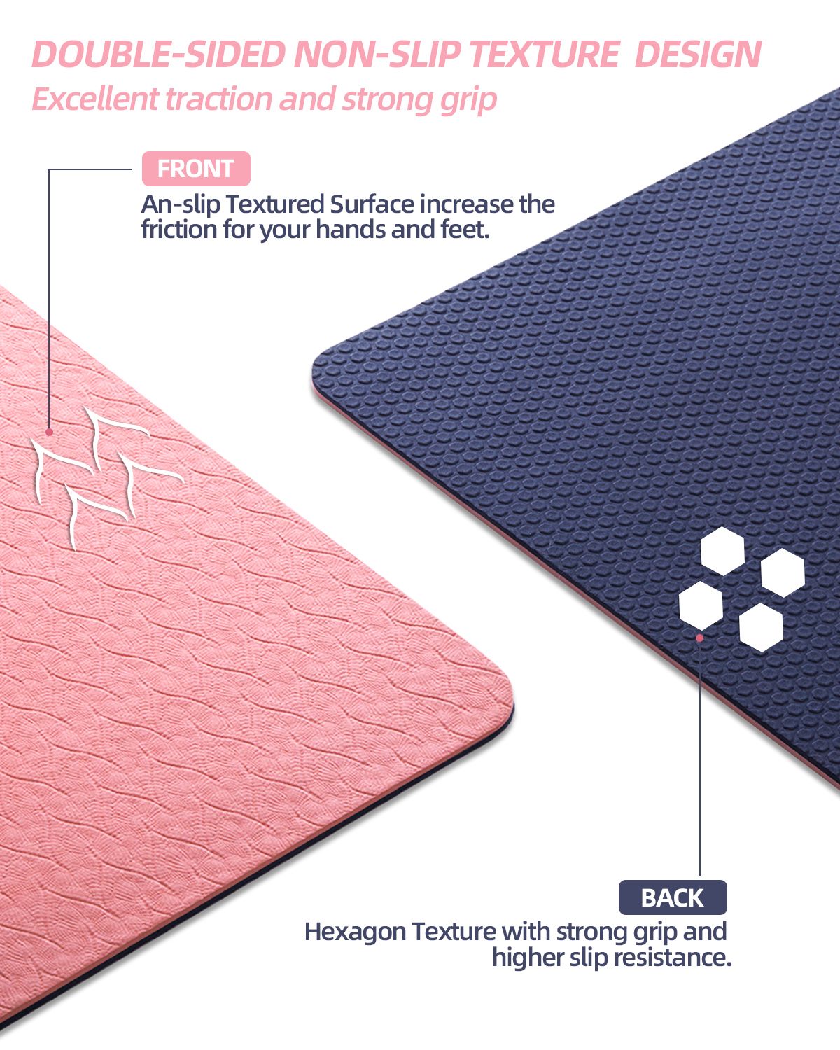 The design of anti-skid texture on both sides and Hexagon texture(unique patented non-slip pattern) on the back, features good cushioning and optimal grip. The yoga mat non slip shows the excellent anti-slipping on all kinds of grounds, for example, wood floor, cement floor,tile floor.