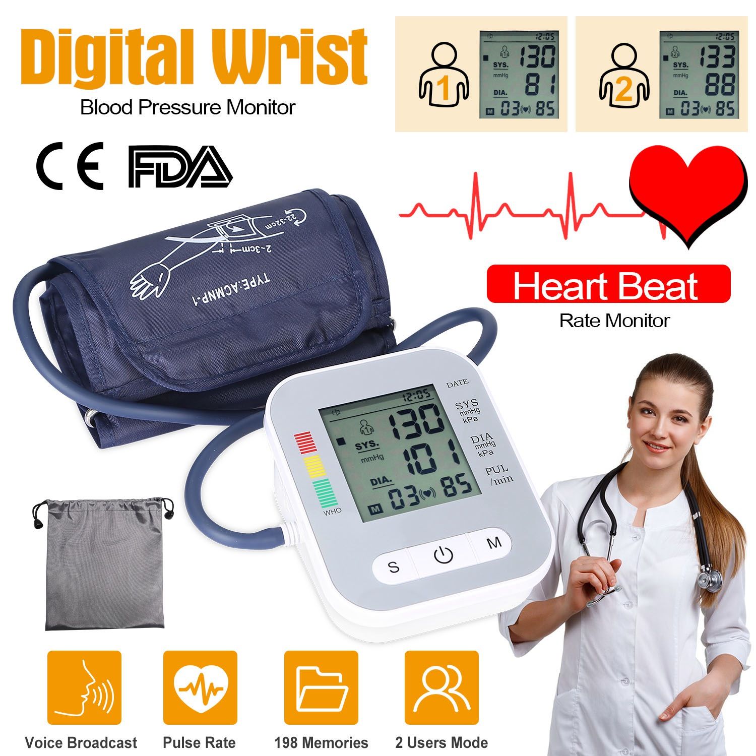 Are you worrying about the healthy status of your parents? Do you want to have a personal doctor to care about your parents’ blood pressure without squeezing into the crowds of people at hospital? Our blood pressure monitor offers an effective solution to regularly measure blood pressure (systolic, diastolic and pulse rate) at home, quick and accurate 3inches LCD screen shows all measurements clearly and broadcast the data, especially easy for the aged to read and listen. Record totally up to198 measurements with date and time, the average value of blood pressure and heart pulse of the last three times, for easy blood pressure tracking. Moreover, the comfortable armband fits for Wrist circumference from 8.66 to 12.6inches, easy to wear by single-hand. Portable storage bag design enables it to accompany with you at home or on travel.