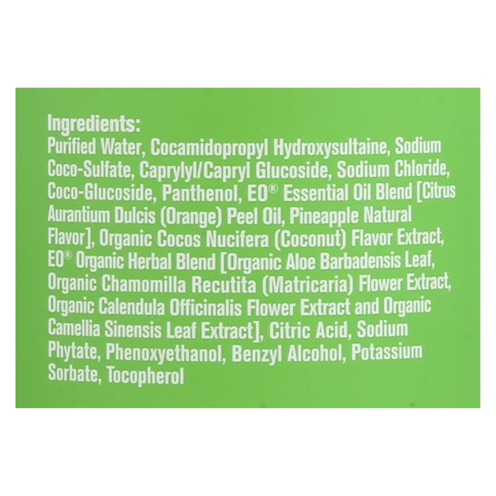 ingredients : purified water;cocamidopropyl hydroxysultaine;sodium coco-sulfate;caprylyl/capryl glucoside;sodium chloride;coco-glucoside;panthenol;eo® essential oil blend [citrus aurantium dulcis;orange;peel oil;pineapple natural flavor];organic cocos nucifera;coconut;flavor extract;eo® organic herbal blend [organic aloe barbadensis leaf;organic chamomilla recutita;matricaria;flower extract;organic calendula officinalis flower extract and organic camellia sinensis leaf extract];citric acid;sodium phytate;phen
