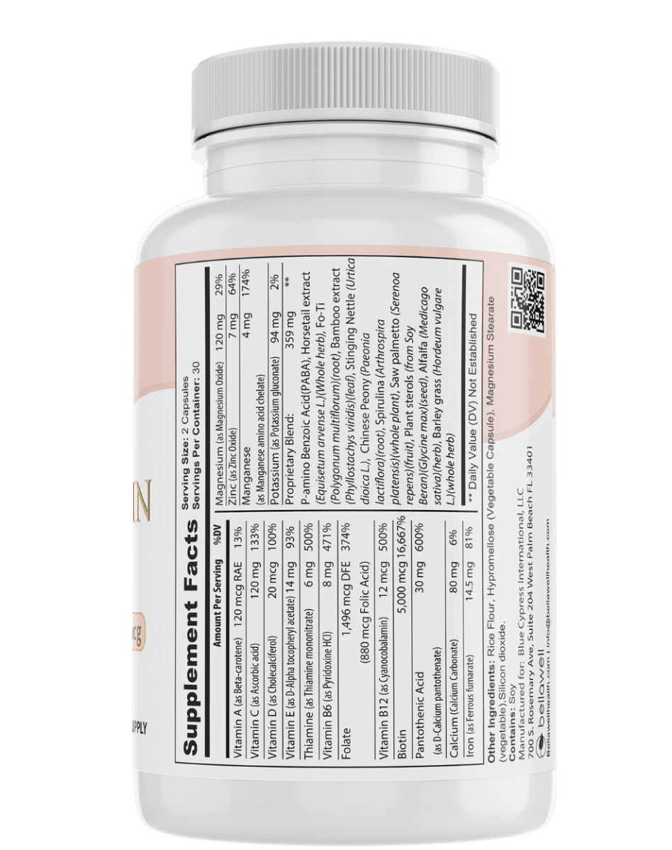 Our Hair, Skin, and Nails supplement is crafted with a thoughtful blend of vitamins that are commonly associated with beauty and wellness. This natural combination of vitamin B6, folic acid, biotin, and vitamins C, D, and E offers support for those looking to enhance their daily nutrient intake.