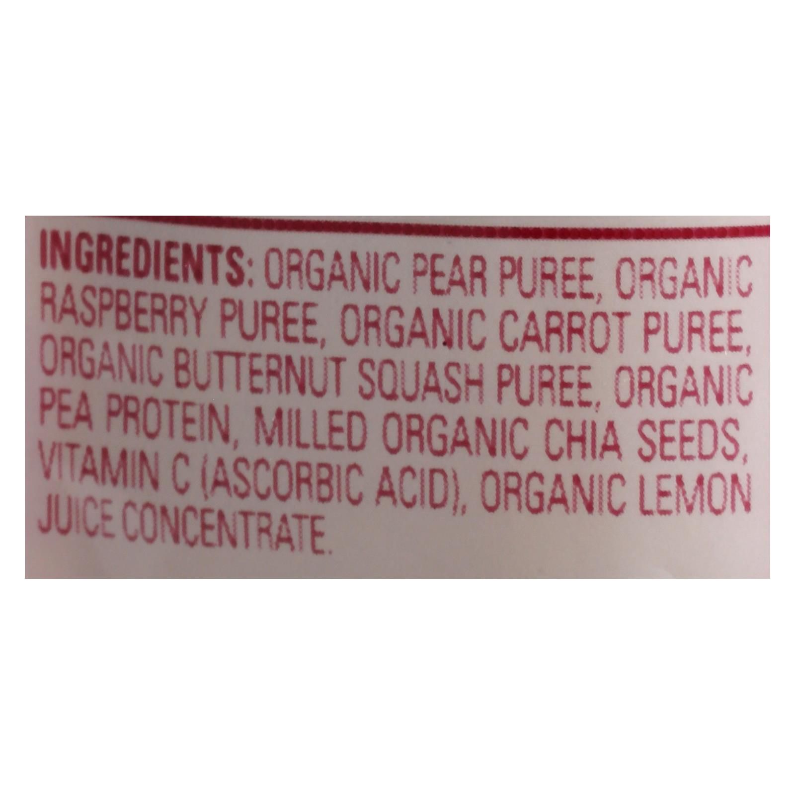 ingredients : organic pear puree;organic raspberry puree;organic carrot puree;organic butternut squash puree;organic pea protein;milled organic chia seeds;vitamin c;ascorbic acid;organic lemon juice concentrate