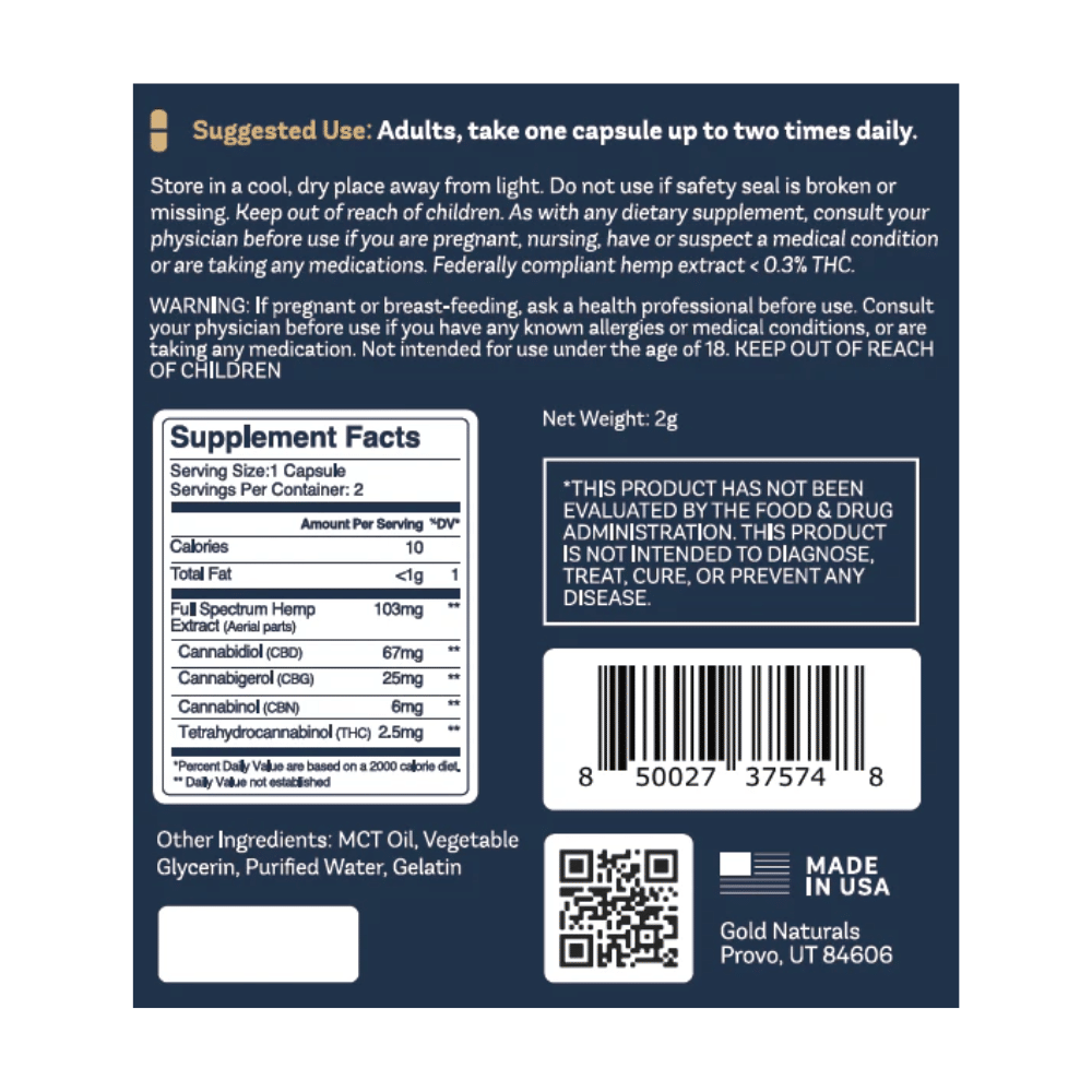 Each capsule combines CBD, CBG, CBN, and over half a dozen naturally occurring cannabinoids that work synergistically through the Entourage Effect—activating your body’s endocannabinoid system to support natural recovery, soothe discomfort, and restore balance.