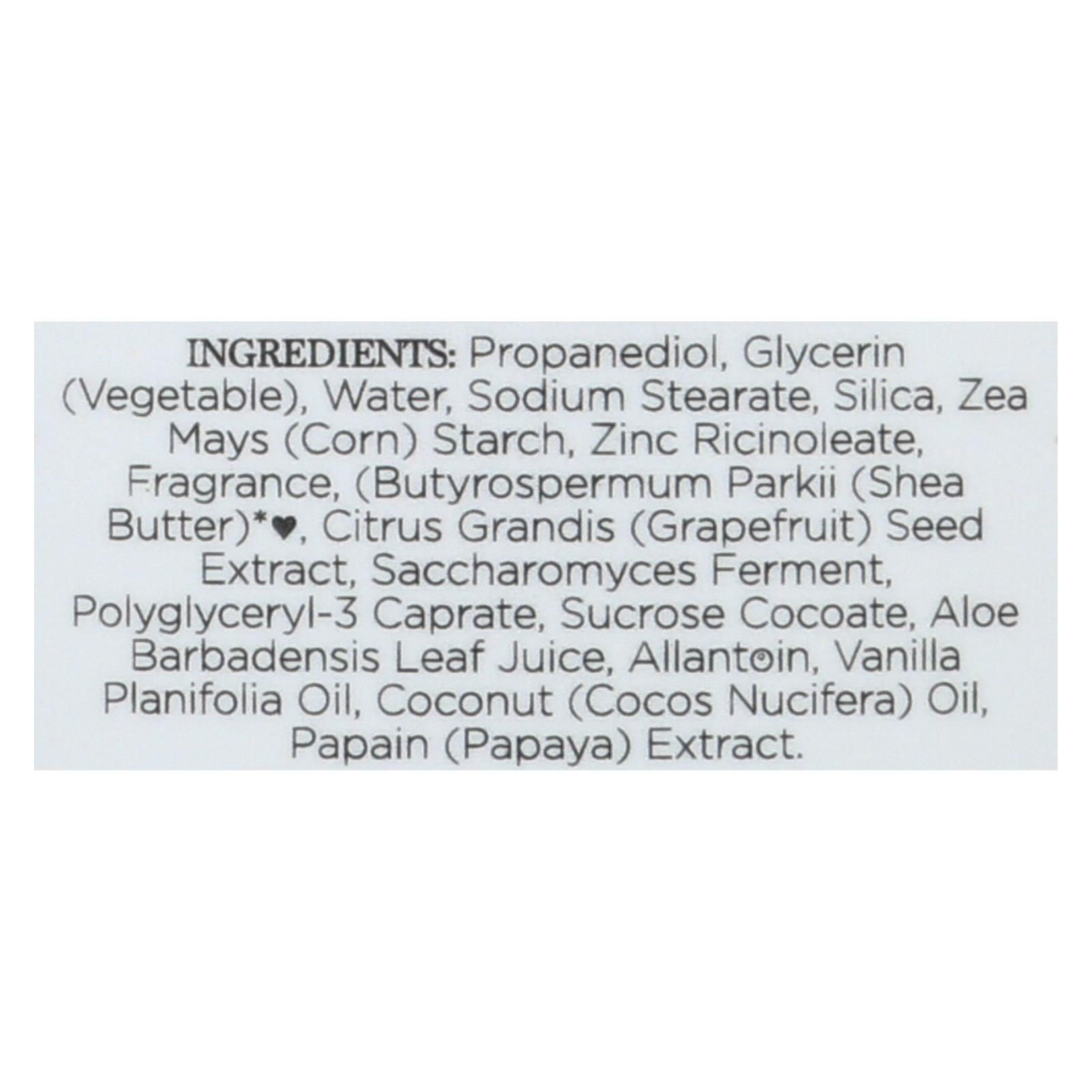 ingredients : propanediol;glycerin;vegetable;water;sodium stearate;silica;zea mays;corn;starch;zinc ricinoleate;fragrance;butyrospermum parkii;shea butter;●. Citrus grandis;grapefruit;seed extract;saccharomyces ferment;polyglyceryl-3 caprate;sucrose cocoate;aloe barbadensis leaf juice;allantoin;vanilla planifolia oil;coconut;cocos nucifera;oil;papain;papaya;extract. *certified organic ingredient ●fair trade ingredient natural may vary in color and consistency