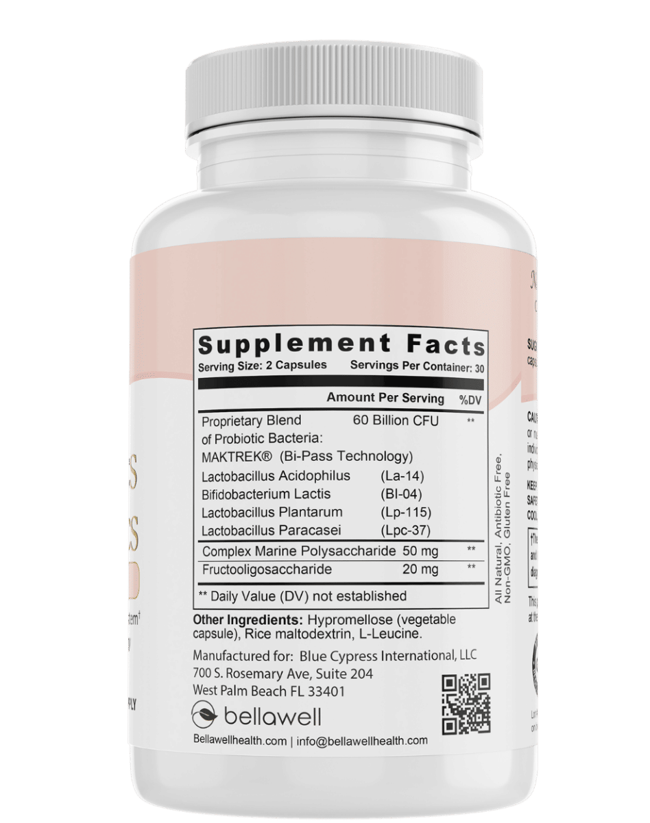 Bellawell's Probiotic 60 billion is a dietary supplement formulated with a blend of four probiotic strains, each contributing to a diverse probiotic profile. This product contains 60 billion CFU (colony-forming units) per serving and includes the following strains: