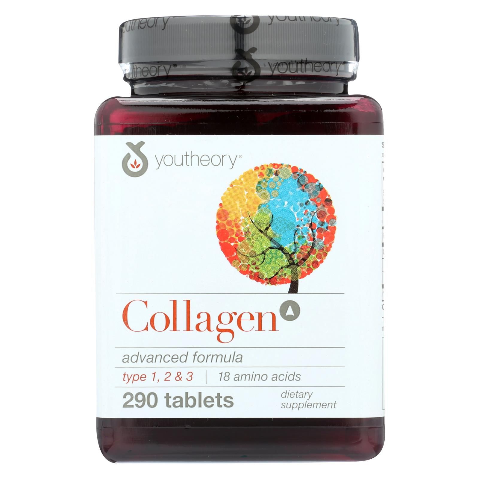 Youtheory collagen advanced dietary supplement is a tablet-derived supplemental source of vitamin c and dietary protein. Use it to replenish collagen and fight the effects of aging on your skin. This gluten-free, soy-free and dairy-free product contains hydrolyzed collagen. There are 290 tablets in this bottle. See the nutrition facts panel for allergens.